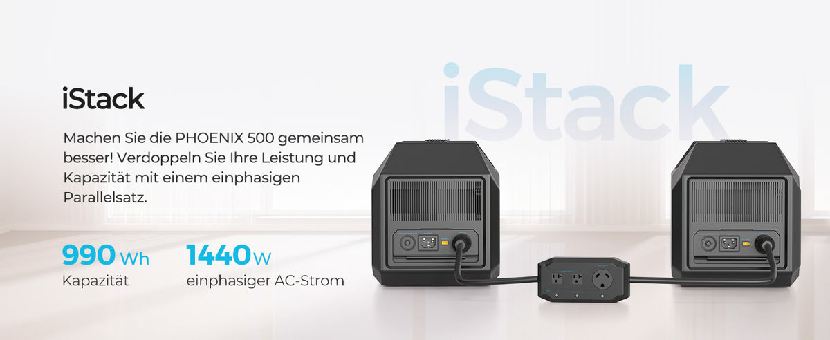 Mit der iStack-Funktion können Sie unterwegs gemeinsam mit einem Freund Energie tanken: Verbinden Sie einfach zwei PHOENIX 500 Powerstations mit einem einphasigen Parallelkit (separat erhältlich), um die Kapazität und die Netzausgangsleistung gleichzeitig zu verdoppeln. Die integrierten LED-Streifen bieten drei Beleuchtungsmodi für stimmungsvolles Licht, und mit der DC HOME App können Sie die PHOENIX ganz nach Ihren Wünschen steuern und einstellen.