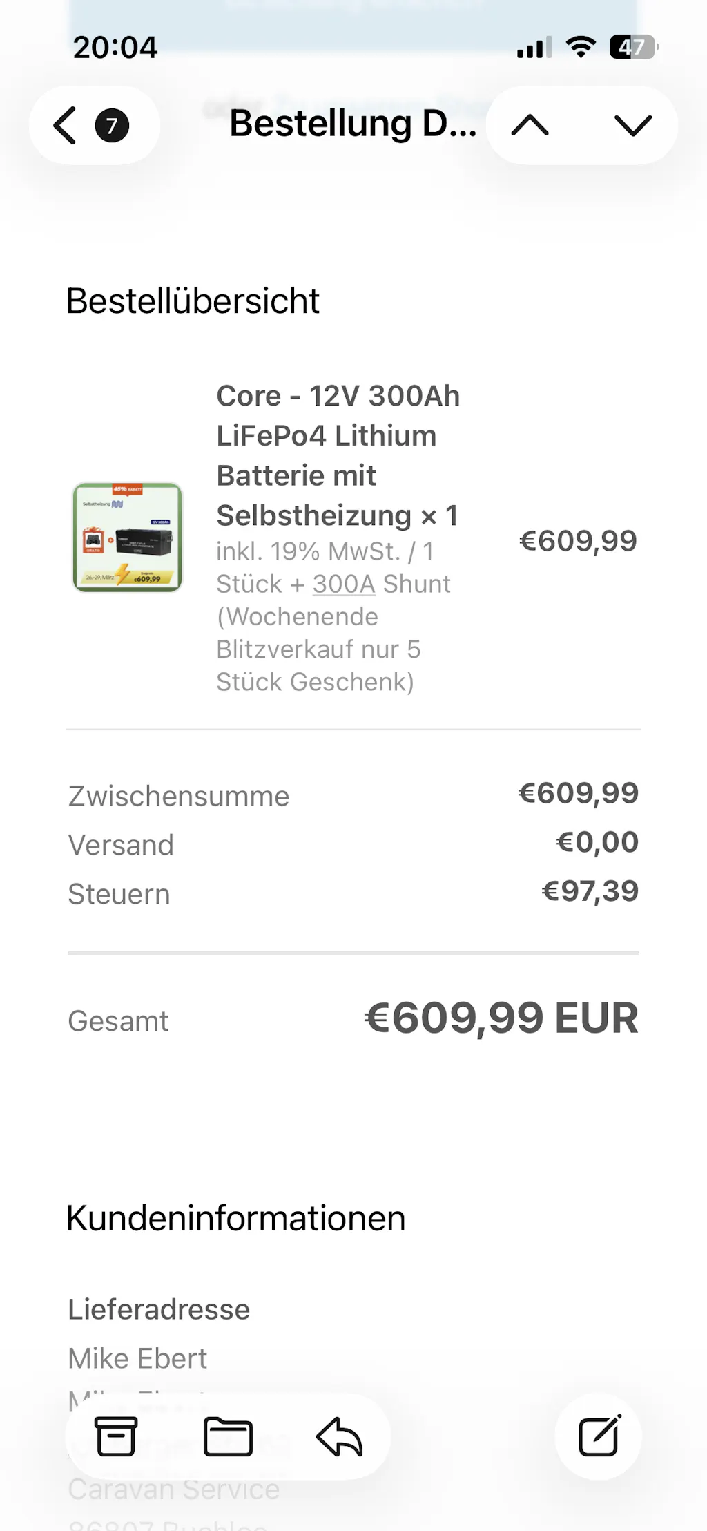 Nach Erhalt der Rücksendung wird Renogy innerhalb von 7 bis 10 Werktagen eine Rückerstattung vornehmen. Renogy benachrichtigt den Kunden per E-Mail, sobald die Rückerstattung bearbeitet wurde. Die Rückerstattung erfolgt über Ihre ursprüngliche Zahlungsmethode. Es kann einige Zeit dauern, bis die Rückerstattung auf Ihrem Bankkonto oder Ihrer Kreditkartenabrechnung erscheint. Wenn Sie innerhalb dieses Zeitraums keine Rückerstattung erhalten haben, überprüfen Sie bitte zunächst erneut Ihre Kreditkartentransaktionen oder Ihr Bankkonto. Wenn die Rückerstattung nach 7 bis 10 Werktagen noch nicht eingegangen ist, wenden Sie sich bitte an den Kundendienst von Renogy. Alle zurückgesandten Artikel werden überprüft, um sicherzustellen, dass sie den Rückgabebedingungen von Renogy entsprechen.