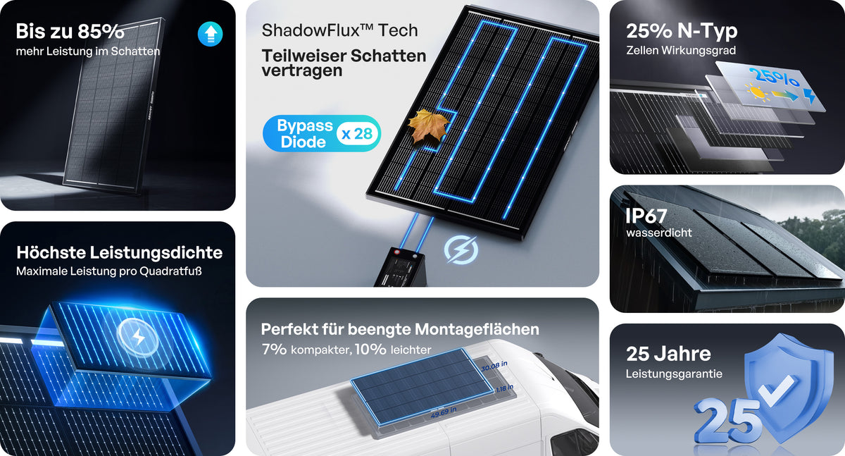 N-Type 16BB Solarzellen mit ShadowFlux™-Layout (28 Bypass-Dioden), bis zu 25 % Zellwirkungsgrad, IP67-Gehäuse; 7 % kleiner und 10 % leichter – ideal für enge Caravans, Class-B Vans und 4×4-Dächer. Vorteile: Stabile Leistung bei australischer Hitze und sogar bei Teilverschattung (bis zu 85 % mehr Energie gegenüber herkömmlichen Modulen getestet), hohe Leistungsdichte, korrosionsbeständiger Rahmen – perfekt für Küstenregionen und Wellblechdächer. Nutzen: Schnellere Solaraufladung tagsüber, weniger Generator- oder Landstromabhängigkeit und längere Off-Grid-Aufenthalte. Mit 25 Jahren Leistungsgewährleistung (Power-Retention) für dauerhafte Zuverlässigkeit.