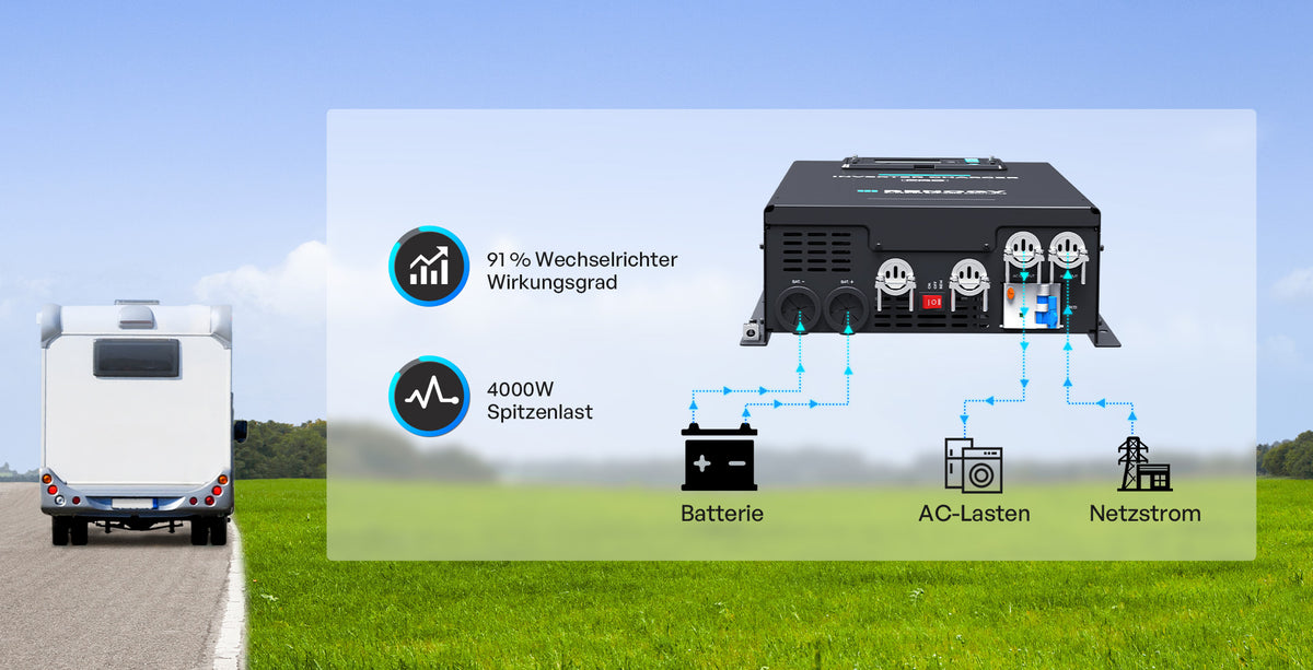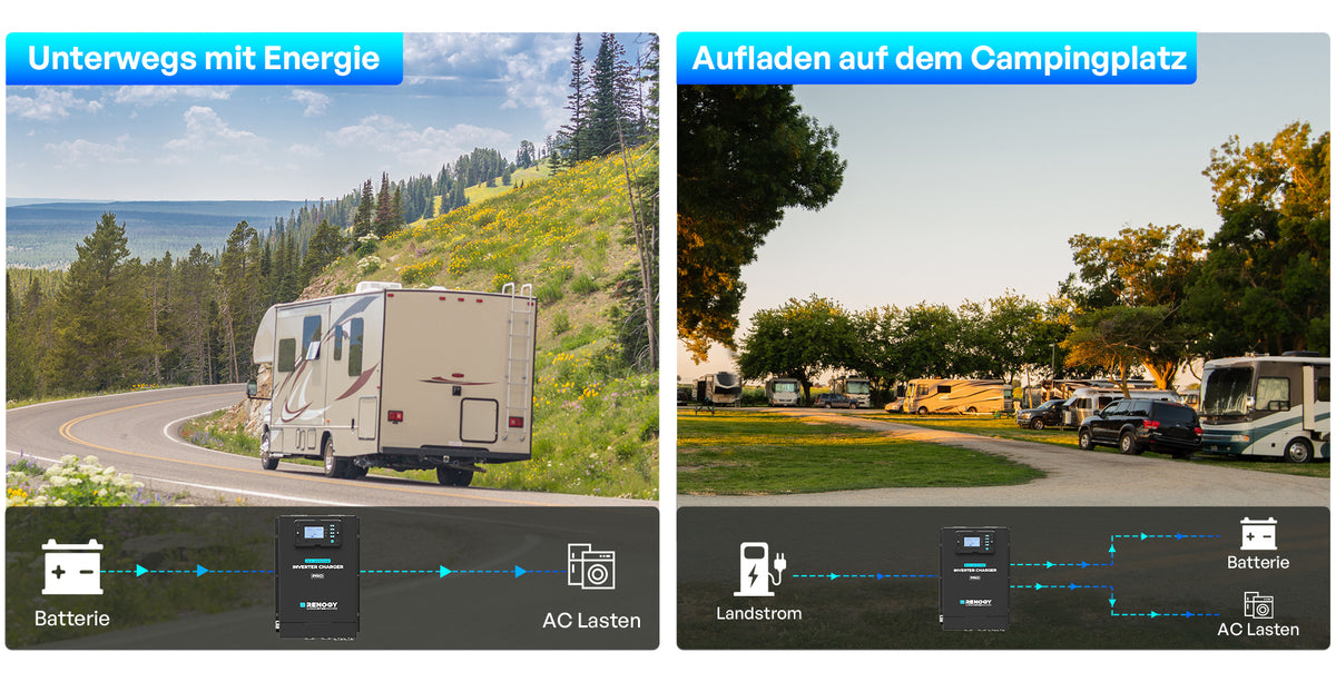 Versorgen Sie Ihr Wohnmobil unterwegs zuverlässig mit Strom und laden Sie es auf dem Campingplatz bequem über das Netz auf.
