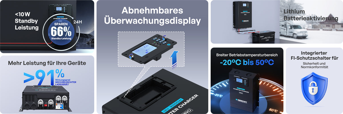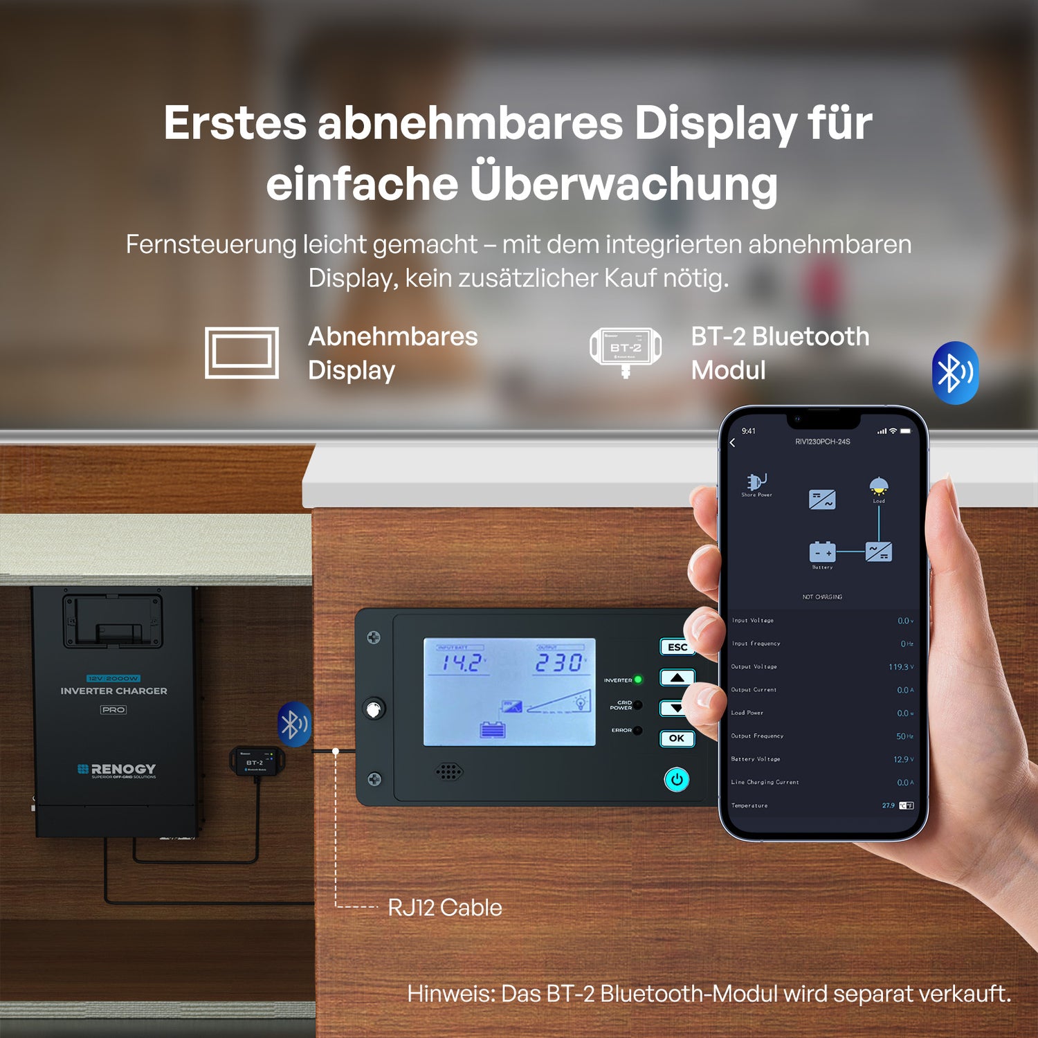 Das Gerät verfügt über ein innovatives abnehmbares Bedienfeld für bequemes System-Monitoring und unterstützt die Fernsteuerung über die Renogy App, wenn es mit dem optionalen BT-2 Bluetooth-Modul (separat erhältlich) gekoppelt wird. Der integrierte RCD-Schutz erhöht die Sicherheit, ohne dass zusätzliche Geräte notwendig sind.