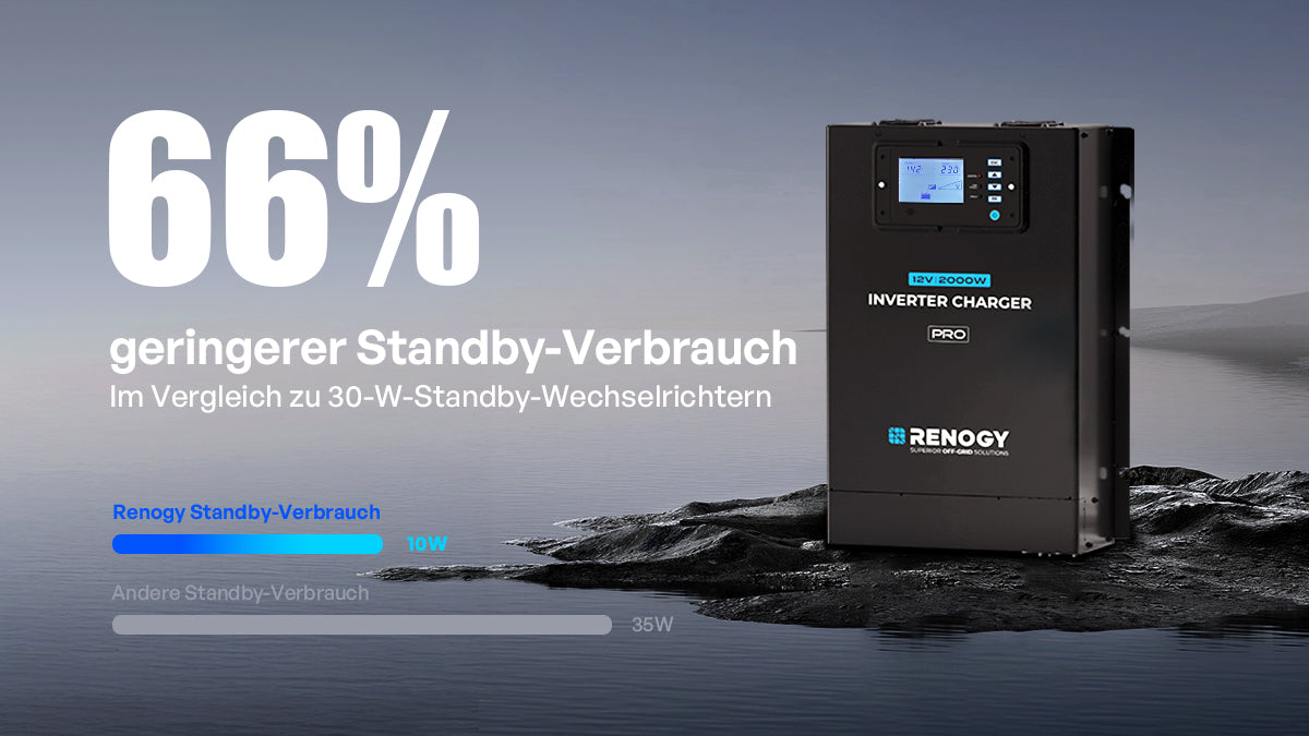Das Renogy Pro 12V 2000W HF Wechselrichter-Ladegerät bietet hocheffiziente und zuverlässige Energie für Off-Grid- und mobile Anwendungen. Mit einer Inverter-Effizienz von über 91 % und einem Standby-Verbrauch von unter 10 W verlängert es die Lebensdauer der Batterien und reduziert Energieverluste. Das leichte, kompakte Design (7,3 kg) ermöglicht eine einfache Installation in engen Bereichen wie Wohnmobilen oder kleinen Hütten.