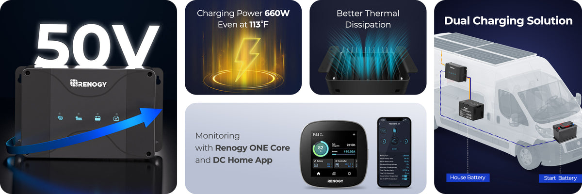 Dual-Source Charging in One Unit Integrates a 50A DC-DC charger (vehicle alternator input) with a high-efficiency MPPT solar controller, simplifying your setup and reducing installation time. Fast & Efficient Power Delivery Maximizes every amp from both your vehicle and solar panels, ensuring rapid battery charging and optimal performance even in changing sunlight conditions.